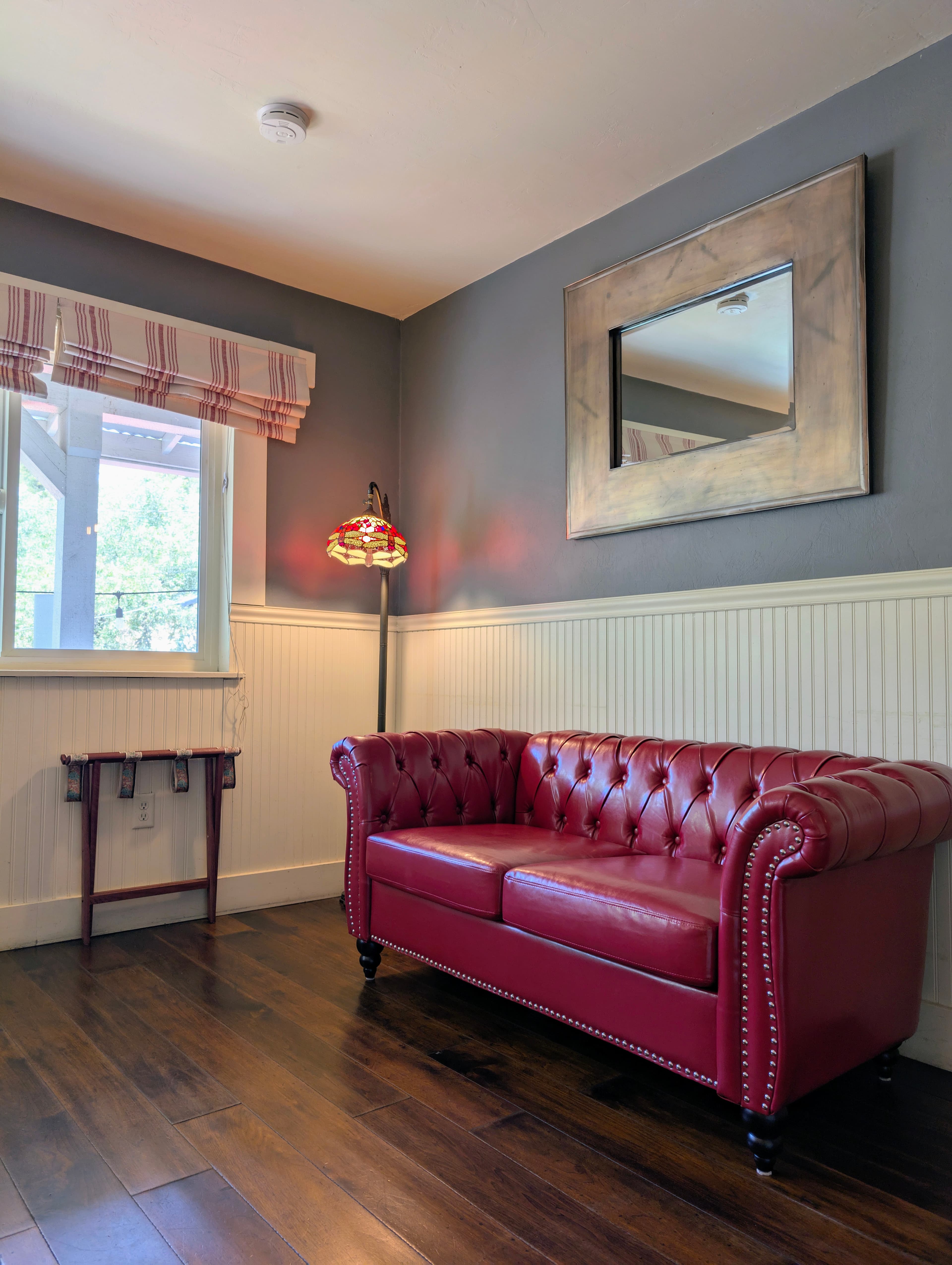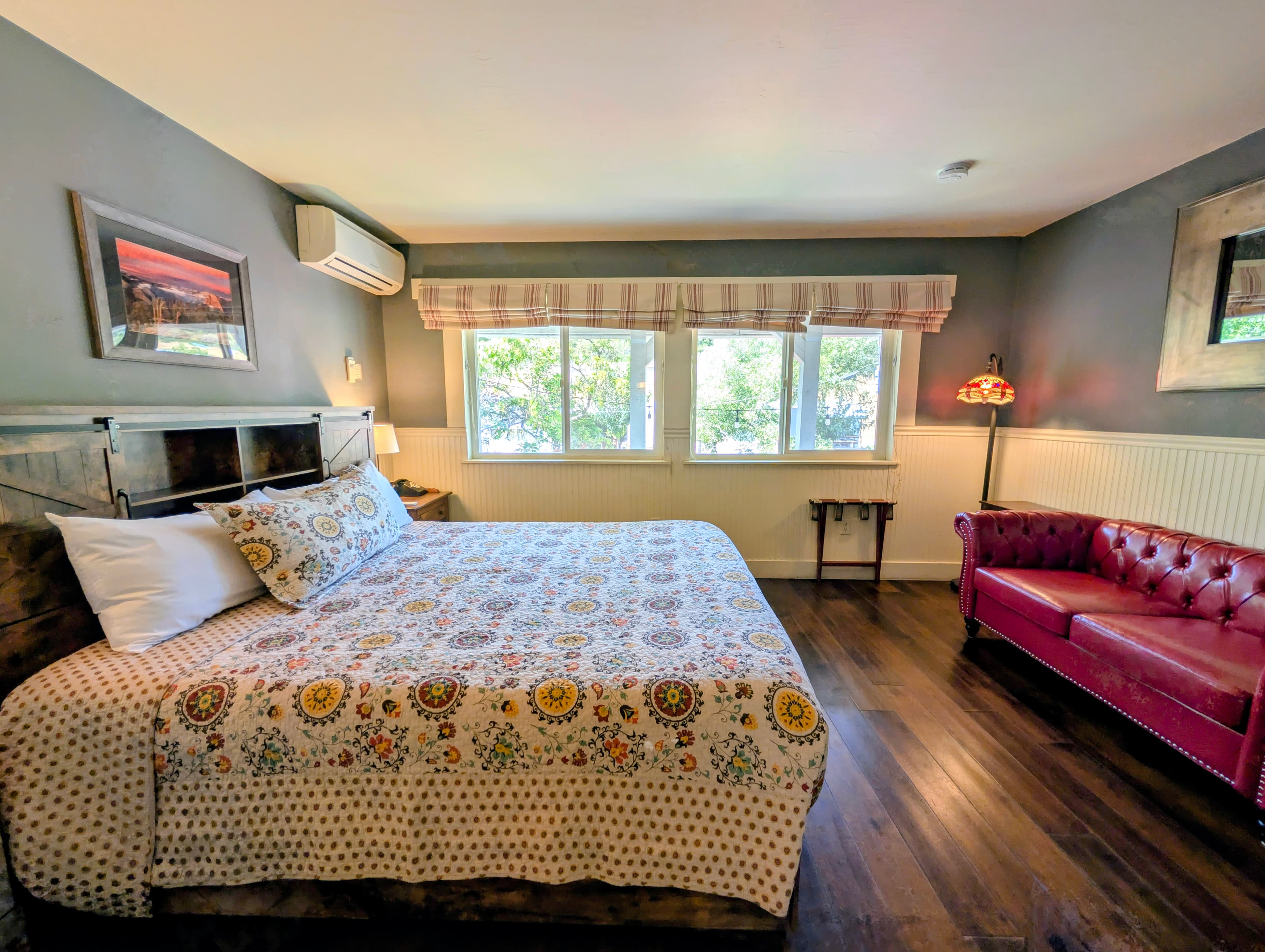 Room 7 is our newly renovated room with beautiful walnut wood floors and charming décor, and is one of our larger rooms with a king-size bed, queen-size futon and a private bathroom with a shower. This pet-friendly accommodation is located on the first floor, so it might not be a good choice for light sleepers or late risers. The rate is based on two people.