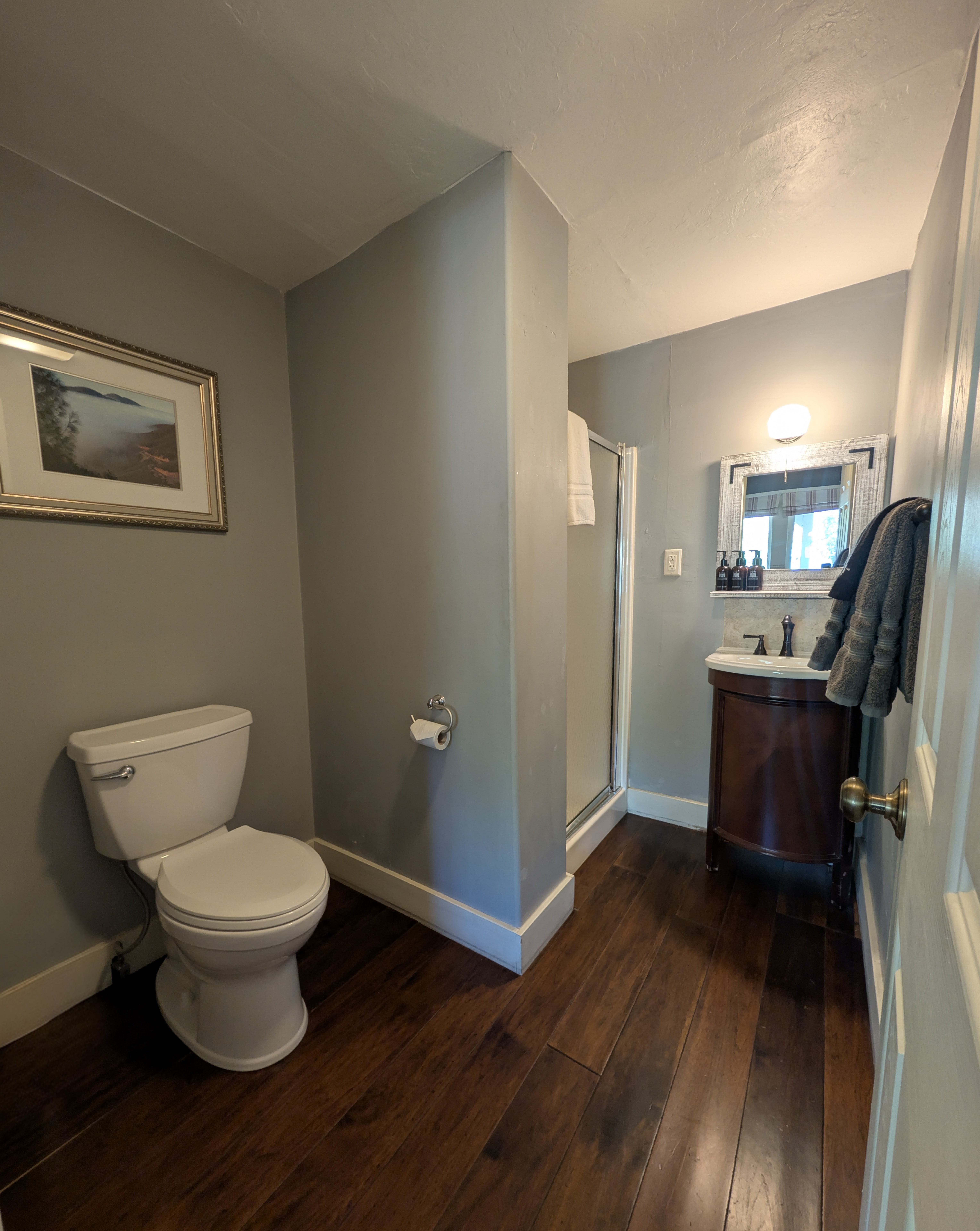 Room 7 is our newly renovated room with beautiful walnut wood floors and charming décor, and is one of our larger rooms with a king-size bed, queen-size futon and a private bathroom with a shower. This pet-friendly accommodation is located on the first floor, so it might not be a good choice for light sleepers or late risers. The rate is based on two people.